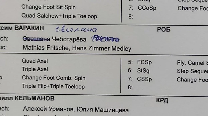«Я заявил четверной аксель? Не знаю ничего, я отправлял другую заявку, с четверным тулупом. Имя тренера тоже зачеркнули, наверное, не понравилось, как написано, решили красивым почерком, ха-ха. Хотел прыгнуть, но пожалел соперников? Да нет, обманывать не буду. Кто-то исправил мою заявку, получается!