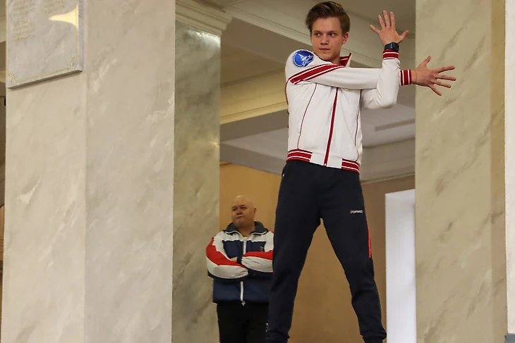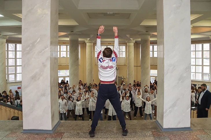 Фигурист Евгений Семененко провел зарядку для студентов Первого Санкт-Петербургского государственного медицинского университета (ПСПбГМУ) имени академика И.П. Павлова.