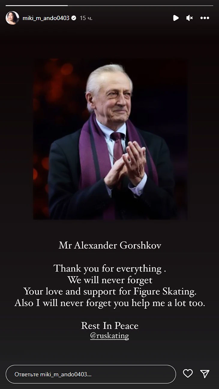 Мики Андо выразила соболезнования в связи со смертью Горшкова: «Никогда не забуду, что вы очень помогли мне. Покойтесь с миром»