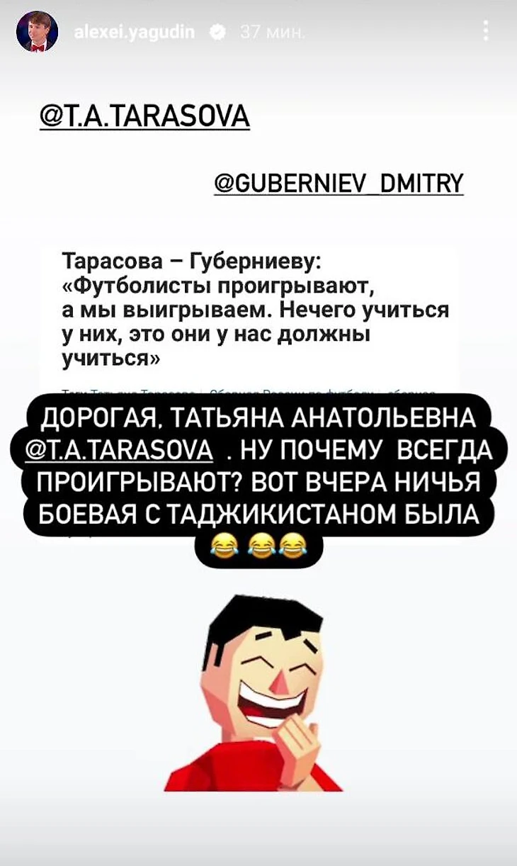 «Дорогая Татьяна Анатольевна, ну почему всегда проигрывают? Вот вчера ничья боевая с Таджикистаном была», – написал Ягудин.