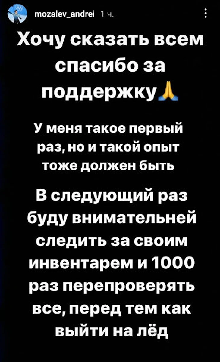 В следующий раз буду внимательней следить за своим инвентарем и 1000 раз перепроверять все перед тем, как выйти на лед», – написал Мозалев.