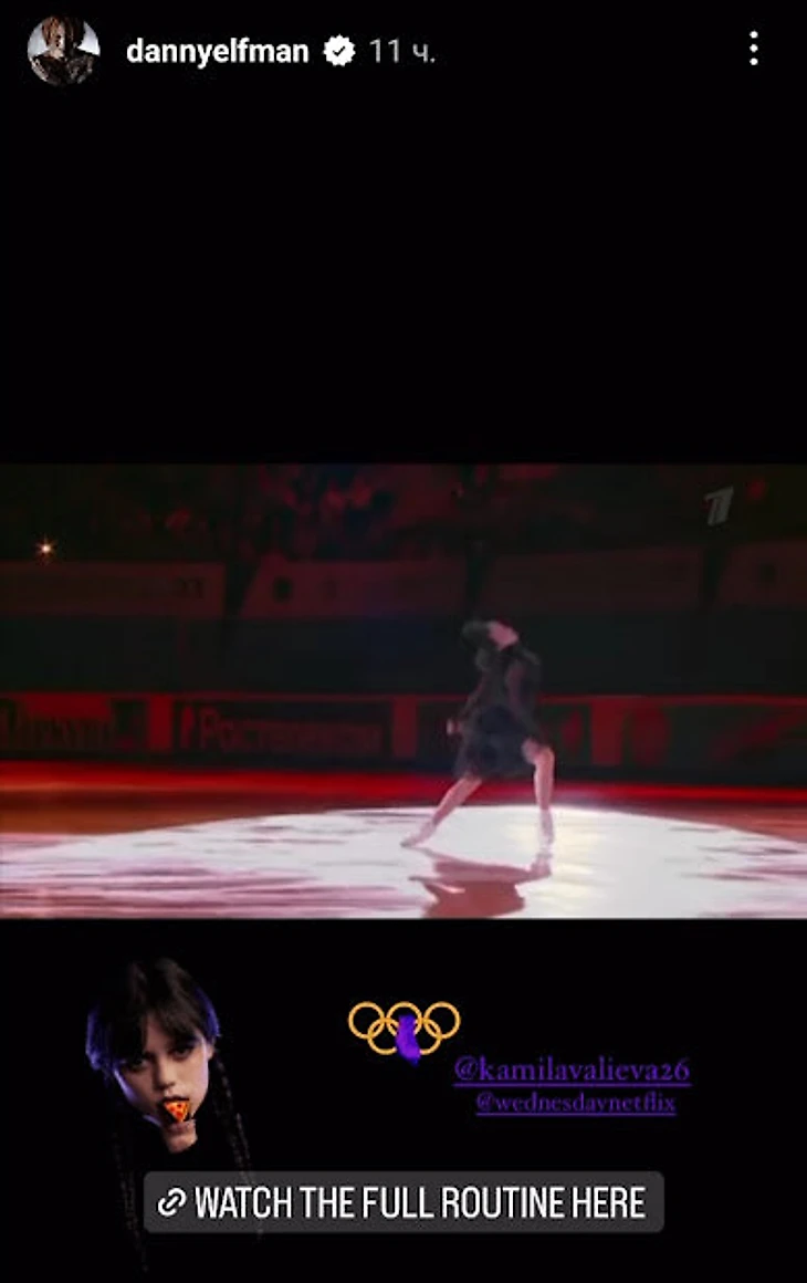 Американский композитор Дэнни Эльфман, написавший музыку к сериалу «Уэнздей», опубликовал в сторис инстаграма видео показательного номера Камилы Валиевой.