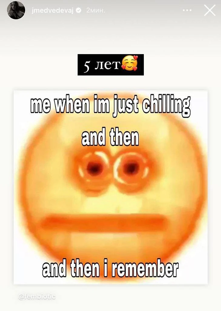 «5 лет🥰», – написала Медведева и прикрепила картинку с изображением смайла, на которой написано «Это я, когда просто отдыхаю, а потом... Потом я вспоминаю».