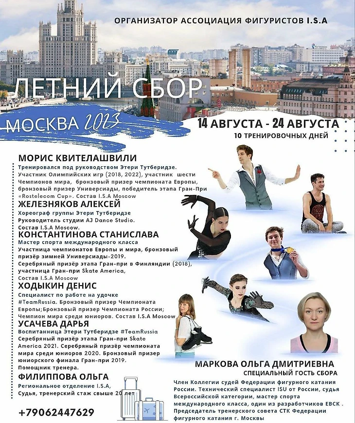 В сборах, проводимых ассоциацией фигуристов I.S.A, также примут участие Станислава Константинова, Морис Квителашвили, Денис Ходыкин и Алексей Железняков.