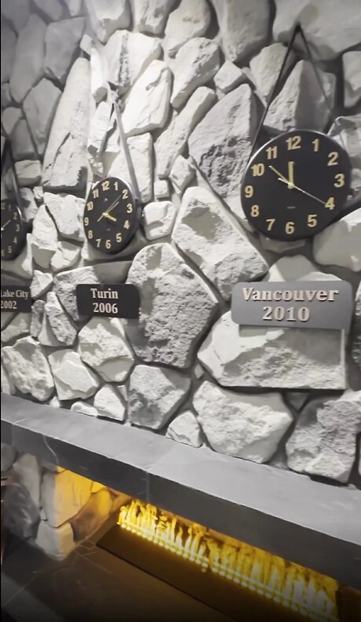 «А это наш просторный рецепшн с каминным уголком», – сказал Плющенко и показал стену у камина, где висят часы, которые показывают время в Солт-Лейк-Сити, Турине, Ванкувере и Сочи.