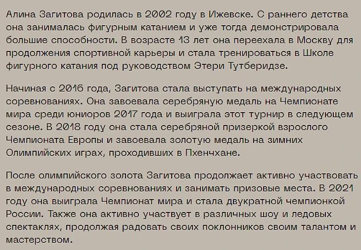 Загитова не выигрывала чемпионат мира-2021 – на нем побеждала Анна Щербакова, а у Алины золото ЧМ-2019. Также спортсменка только раз выигрывала чемпионат России, а не два – у нее золото ЧР-2018.
