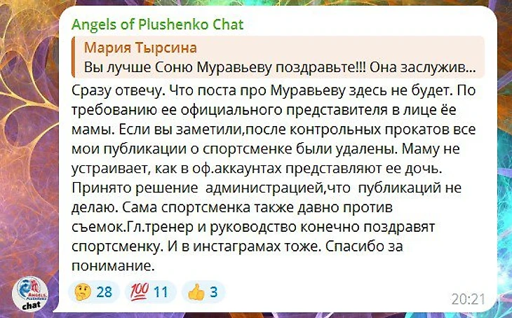 «Сразу отвечу. Что поста про Муравьеву здесь не будет. По требованию ее официального представителя в лице ее мамы. Если вы заметили, после контрольных прокатов все мои публикации о спортсменке были удалены.