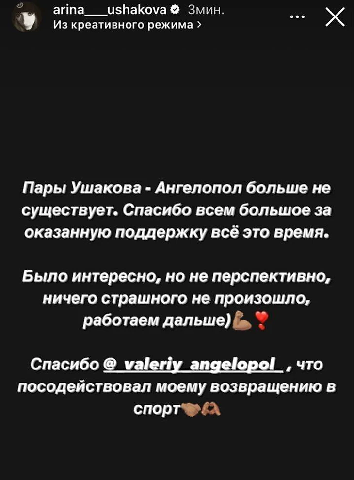 Танцевальная пара Арины Ушаковой и Валерия Ангелопола распалась.