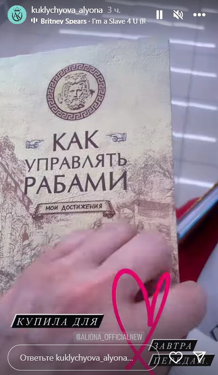«Купила для Алены Косторной. Завтра передам», – написала дизайнер в сторис, показав блокнот с надписью «Как управлять рабами. Мои достижения» на обложке.