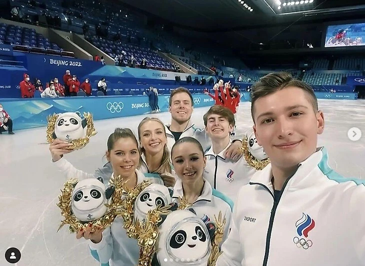 Соколовская опубликовала совместное фото российских фигуристов, которые участвовали в команднике – Камилы Валиевой, Марка Кондратюка, Анастасии Мишиной и Александра Галлямова, Виктории Синициной и Никиты Кацалапова.