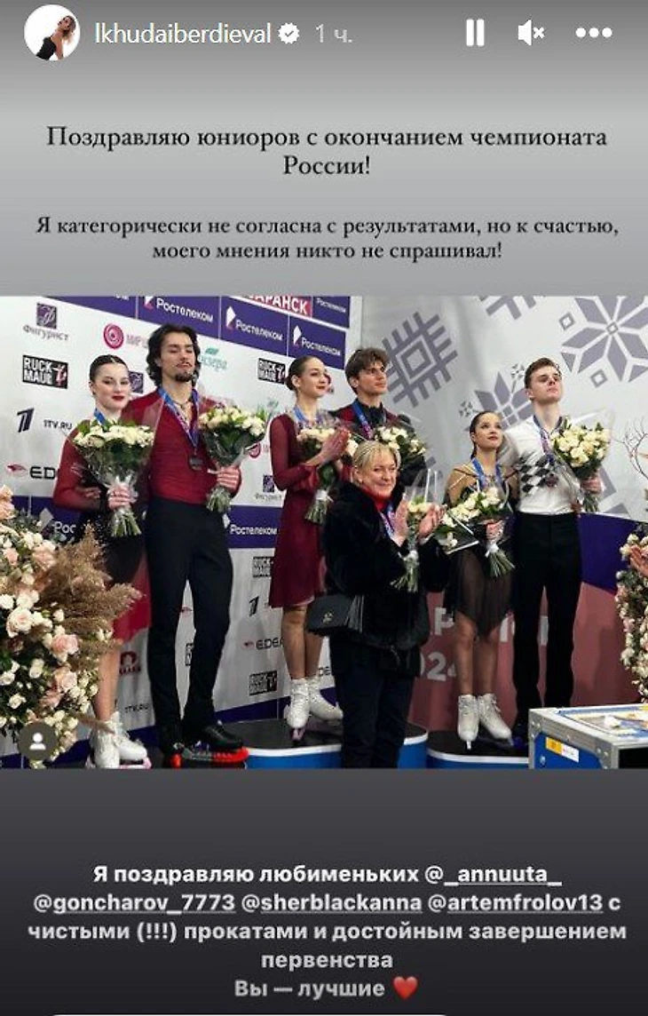Я поздравляю любименьких Анну Щербакову, Егора Гончарова, Анну Коломенскую, Артема Фролова с чистыми (!!!) прокатами и достойным завершением первенства. Вы – лучшие», – написала чемпионка России-2023 в танцах на льду Елизавета Худайбердиева.