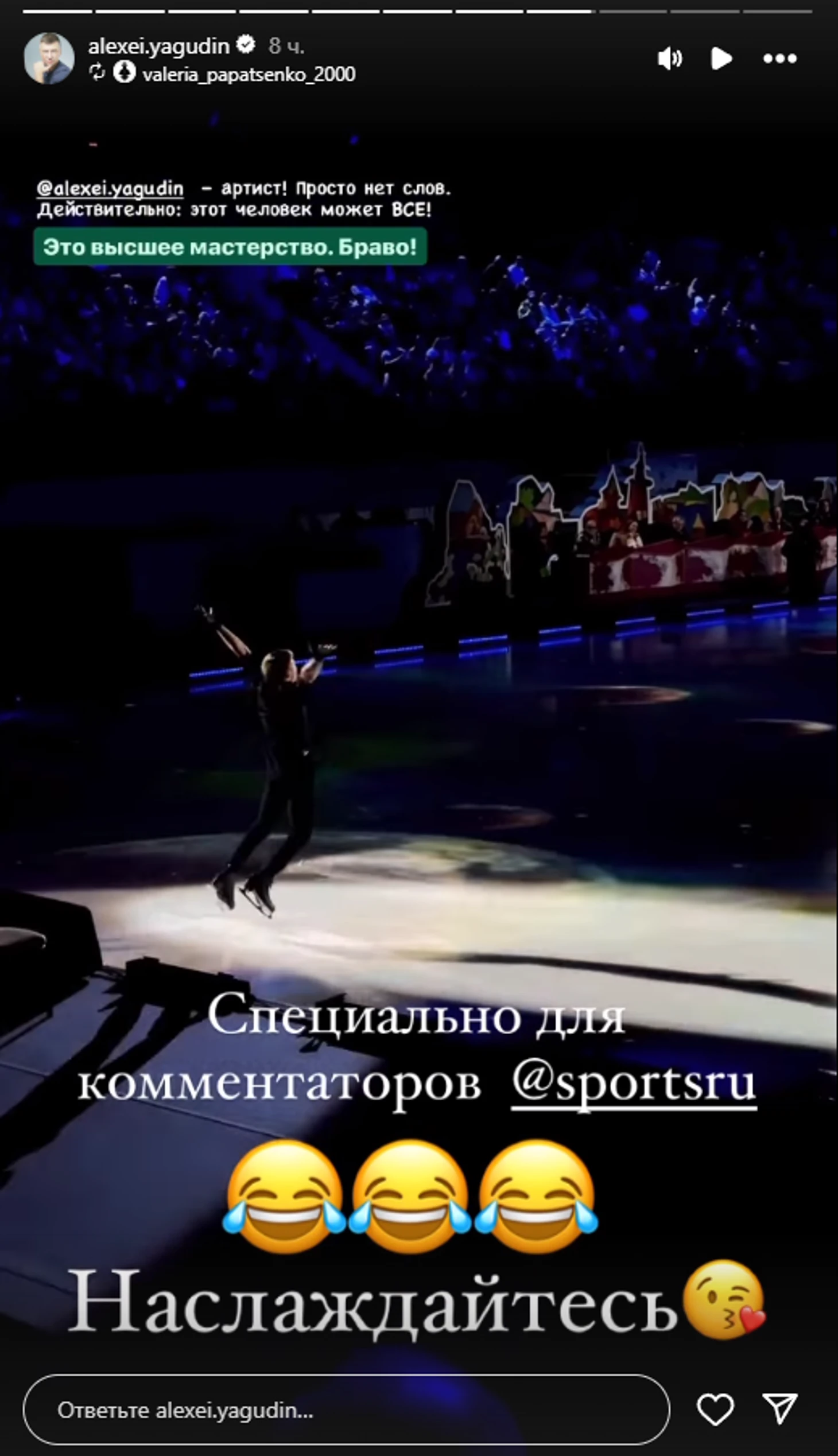 «Специально для комментаторов Sports.ru 😂😂😂 Наслаждайтесь 😘», – написал Ягудин под цитатой в сторис.
