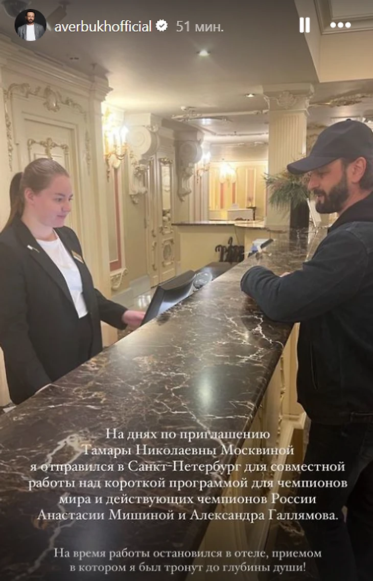 «На днях по приглашению Тамары Николаевны Москвиной я отправился в Санкт-Петербург для совместной работы над короткой программой для чемпионов мира и действующих чемпионов России Анастасии Мишиной и Александра Галлямова», – написал хореограф в соцсети, опубликовав фотографию из поездки.