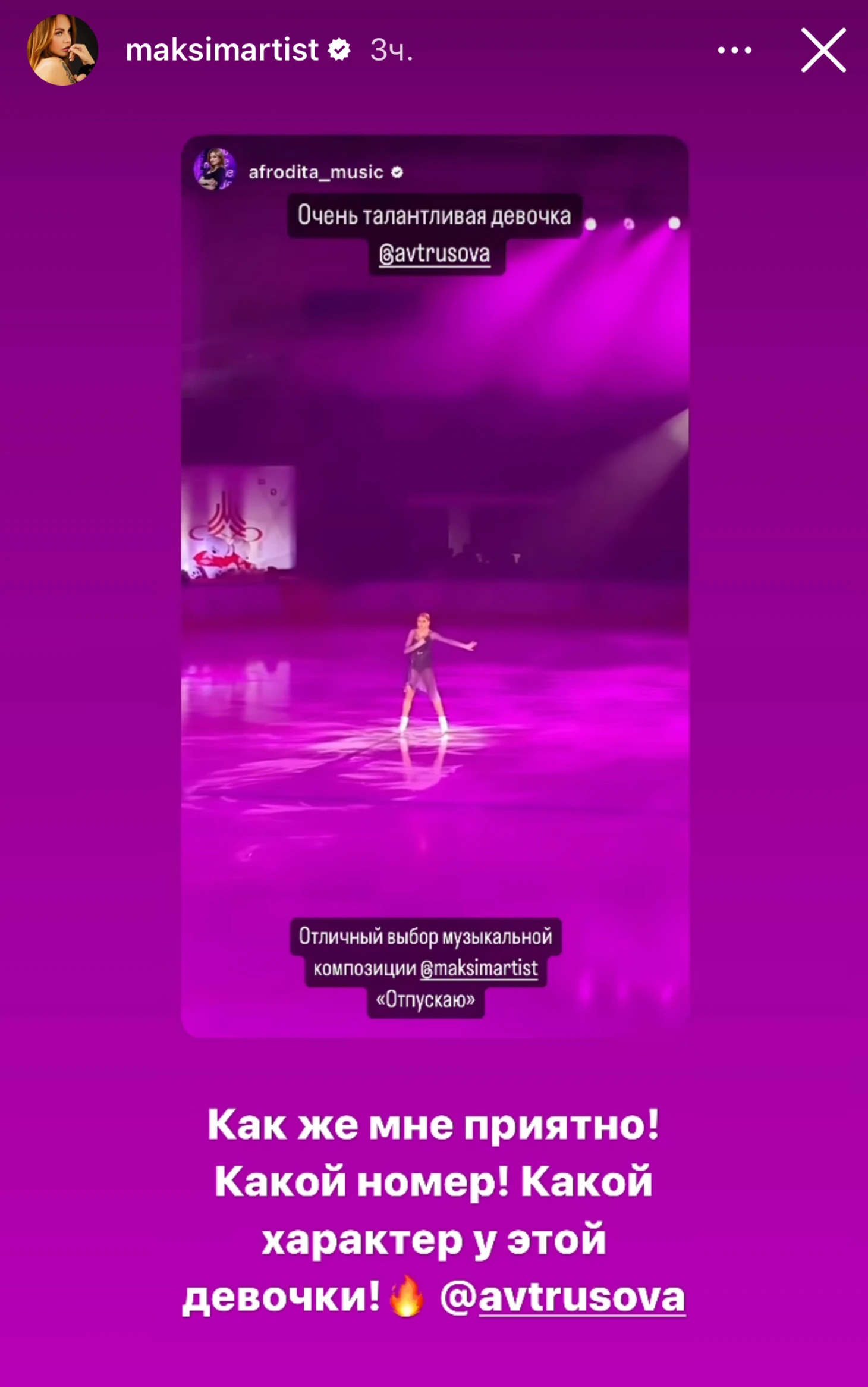 «Как же мне приятно! Какой номер! Какой характер у этой девочки!» – написала певица, репостнув отрывок проката Трусовой.