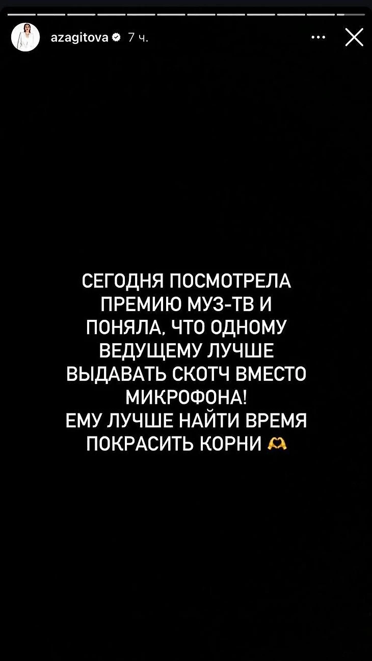 «Сегодня посмотрела премию «Муз-ТВ» и поняла, что одному ведущему лучше выдавать скотч вместо микрофона! Ему лучше найти время покрасить корни», – написала Загитова в сторис.