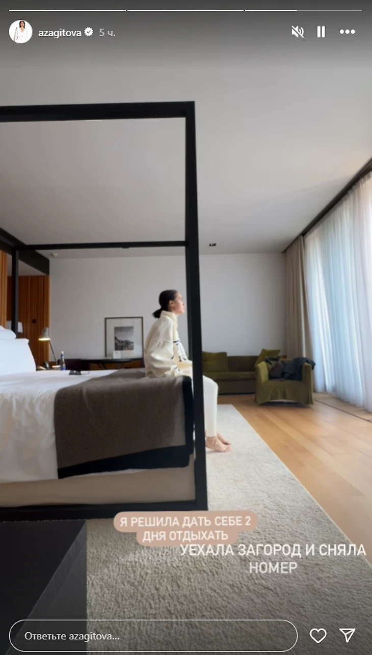 «Я решила дать себе 2 дня отдыхать. Уехала за город и сняла номер», – написала Загитова в сторис.