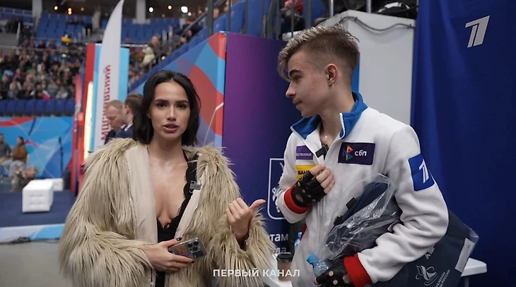 «Кстати, мы сегодня с тобой на одном вайбе: секси-мальчик (показывает на Самсонова – Спортс’‘), ну и я тоже ничего такая», – сказала Загитова во время беседы с фигуристом.