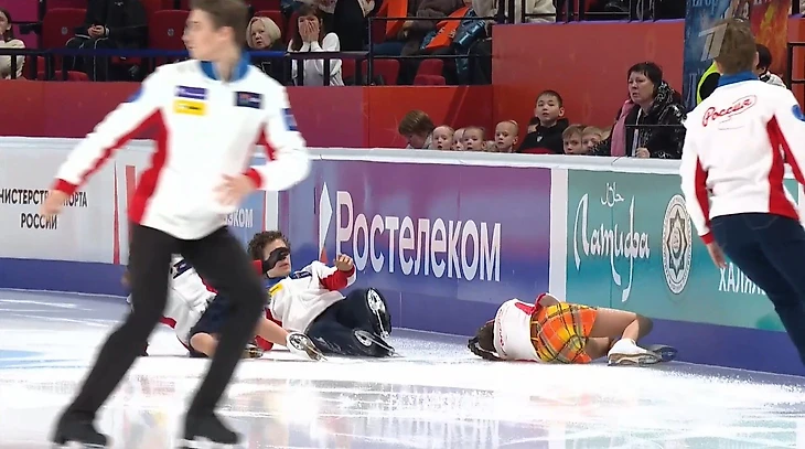 Фигуристы столкнулись друг с другом и упали на разминке чемпионата России.