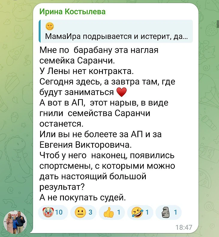 Ирина Костылева написала сообщение в чате телеграм-канала Спортс’‘ «Фигурное катание», где обсуждали результаты короткой программы на первенстве Москвы.