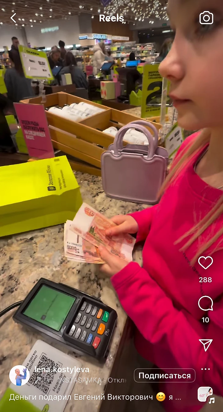 «Деньги подарил Евгений Викторович 😊 Я трачу на нужное, у меня не было косметики! Спасибо❤️», – написала Костылева в описании под видео.