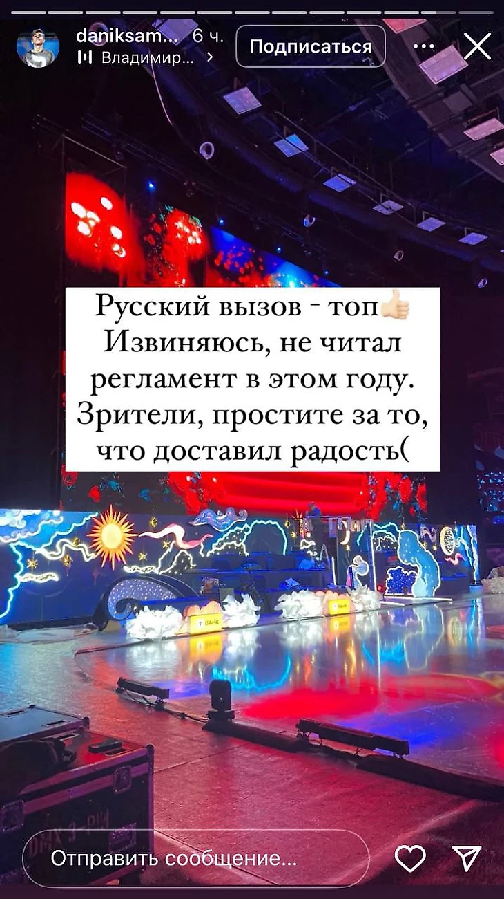 «Русский вызов – топ. Извиняюсь, не читал регламент в этом году. Зрители, простите за то, что доставил радость», – написал Самсонов в сторис.