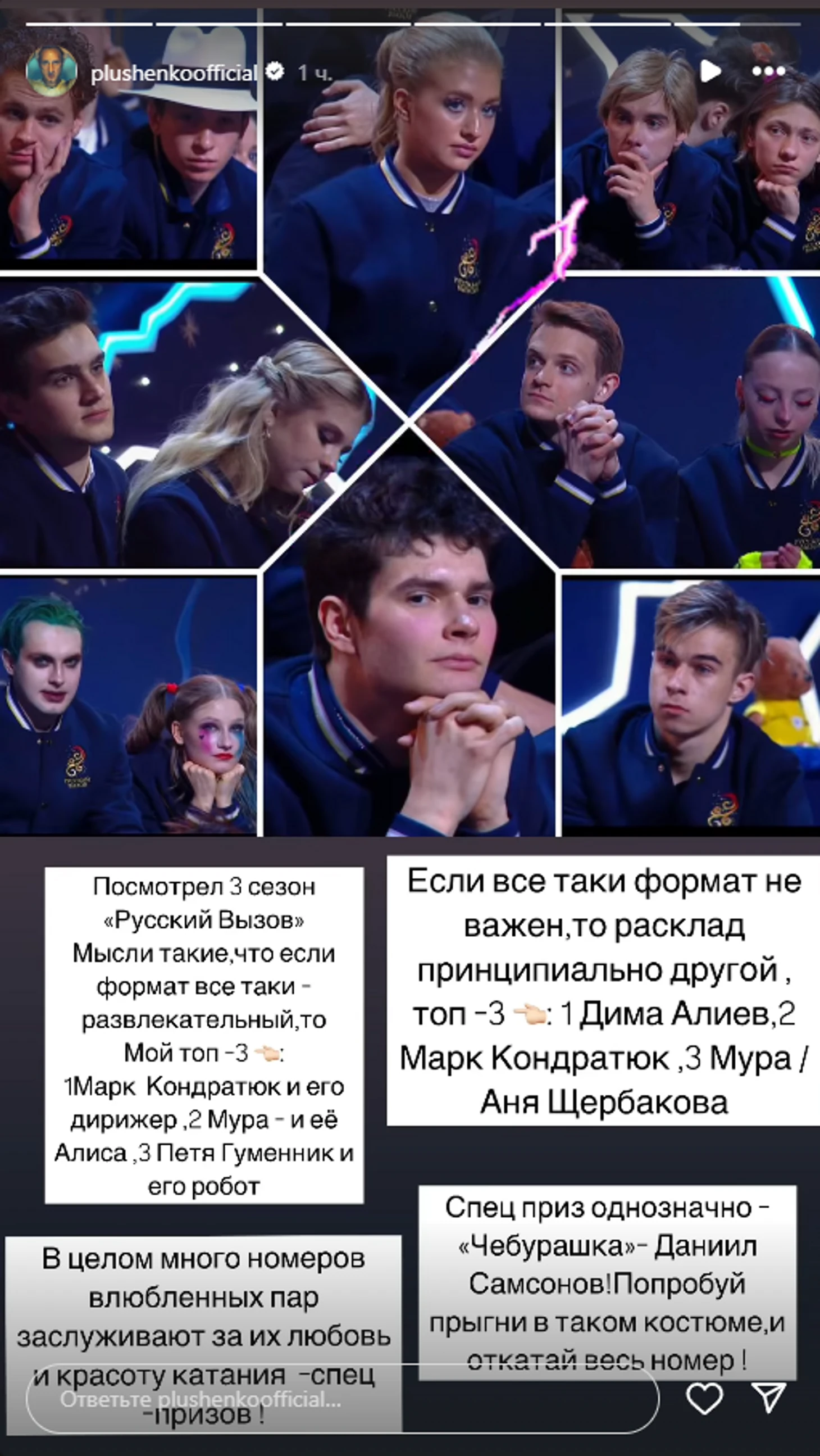 В целом много номеров влюбленных пар заслуживают – за их любовь и красоту катания – спецпризов. Спецприз, однозначно, «Чебурашка» – Даниил Самсонов! Попробуй прыгни в таком костюме и откатай весь номер!» – написал двукратный олимпийский чемпион Плющенко в соцсети.