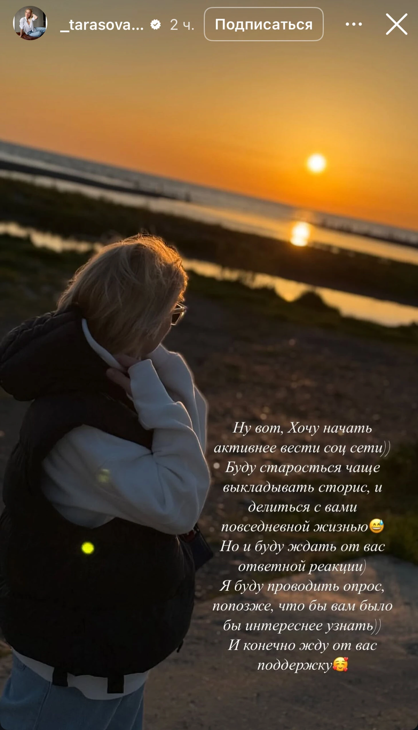 «Ну вот, хочу начать активнее вести соцсети. Буду стараться чаще выкладывать сторис и делиться с вами повседневной жизнью. Но и буду ждать от вас ответной реакции.
