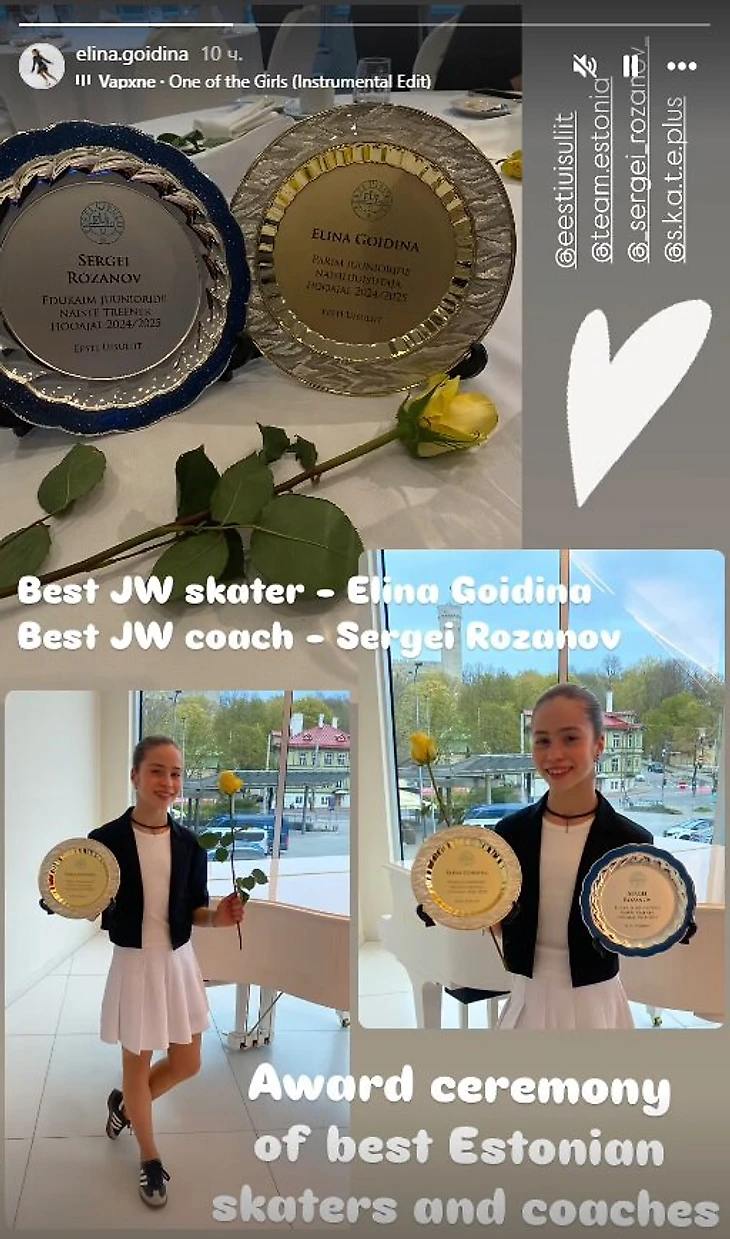 Эстонская фигуристка Элина Гойдина опубликовала в соцсетях фото с наградами: ее признали лучшей юниоркой, ее наставника Розанова – лучшим тренером юниорок.