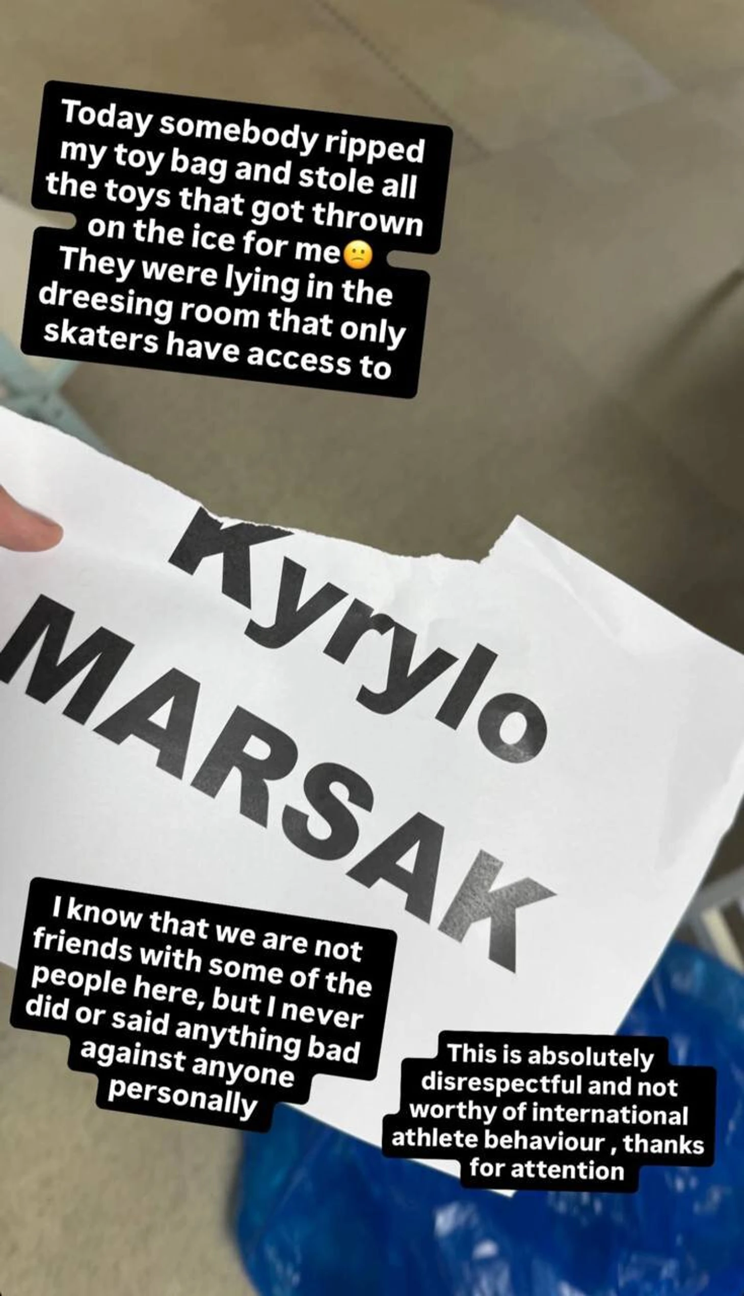 «Сегодня кто-то порвал мой пакет с игрушками. Украли все игрушки, которые мне выбросили на лед. Они лежали в раздевалке, доступ к которой есть только у фигуристов.
