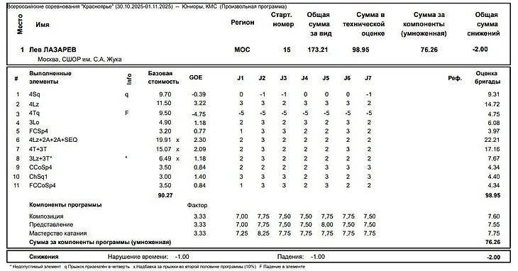 Фигурист получил за прокат 173,21 балла (98,95 – за технику).