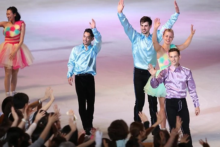 Второе отделение открывал Дай с 'Lilac Wine'. Сделал свои воздушные 3Л, 3Ф, быстрые вращения, включая заклон. Выглядел он спокойно и мягко, без напряжения. Наверное потусил со своей бывшей командой Японии, и никаких нервов. Сатоко показала новую КП "Вальс" в светло-голубом платье. Сделала 2А, 3Ф, 3Л-3Т, всё чистенько, аккуратненько и ... пресно. Адам также показал КП, с 3Ф, 1А, 3Л-риппон, отжиг в ночном клубе, но не дешёвом, даже со вкусом. Разбавляет несколько традиционный фк музон. Рошетт- тот же текст, что и о Нагасу. Шома катал ПП Танго. У него отошла шлица на брюках в самом начале, ему пришлось её на ходу укреплять, но он продолжил и сделал хороший 4Т. Также были три попытки трикселя, все ушли в степаут. А вот тройные у Шомика очень низенькие, тут без изменений. Тем не менее номер он публике продал, несмотря на косяки. Потом Шома с Даем показали небольшой совместный номер 'Gett Off'. Дай отдал сцену Шоме для финального поклона, а тот всё отказывался такую честь от своего кумира принять. Ну в итоге пришлось Шоме согласиться. Hubbell/Donohue катали КТ. Боже мой, какой ужас. Нарезка- как грязнющий диск, скачет с одного на другое. Костюмы- словами не описать. А танцевали чего? Она кстати довольно крупная и тяжело на льду выглядит. Каро- Summer Time. Рафинированно, изысканно и тепло. Сделала 3Т с 3С. Чан вышел в футболке за 5 копеек и в джинсах за 8. Ему меньше всех платят что ли? Совсем охамел. Прыгал свой девчачий набор из 3Т, 3С и 2А. И катался по тому же принципу, что и Нагасу-Рошетт. Sunday morning играет, Патрик вспоминает какие-то движения из разных прог и их делает. Вся хореография на этом. Мао представила новую показалку под Баха. Вот уж от кого я такого не ожидала, так это от Лори. Изумительное хорео, всё идеально в музыку, дорожки балерины Мао, прекраснейший исторический танец эпохи, нестандартный костюм под стать. Сделала 3Ф, 3Р, 2А. В финале все оттягивались, Дай с компанией- под 'Moves Like Jagger'. А потом был большой тортик в честь 10-летия шоу.
