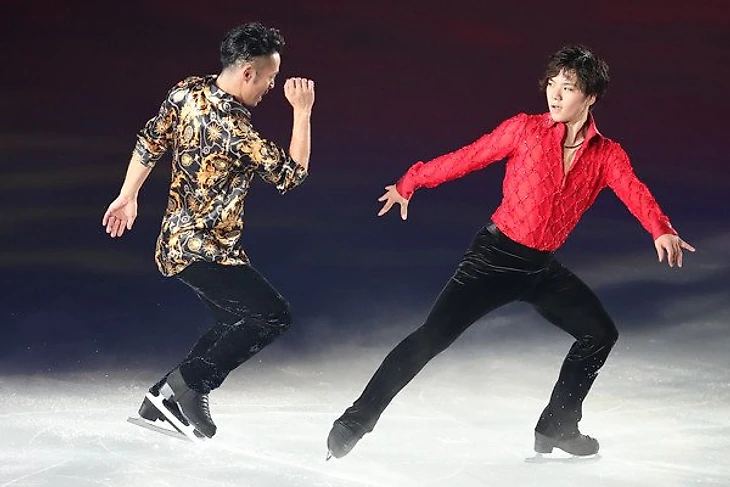 Прокатилась сегодня с ветерком в Осаку. Ну и жара там была, +36С, самое то на ледовой арене прохлаждаться. Номер Открытие был под Гершвина 'Rhapsody in Blue'. Мао естественно было первая на льду, в красивом белом платье. Японские мальчики Дай, Мура, Шома вышли крутой группой в кожаных желетках. Шома сделал 3Ф, затем Мура 3Л, Дай упал смешно на 3Ф, Шома к нему присоединился, ну и Мура добавил бабочку на трикселе. Далее весь кастинг показался в бело-сапфирных красках.