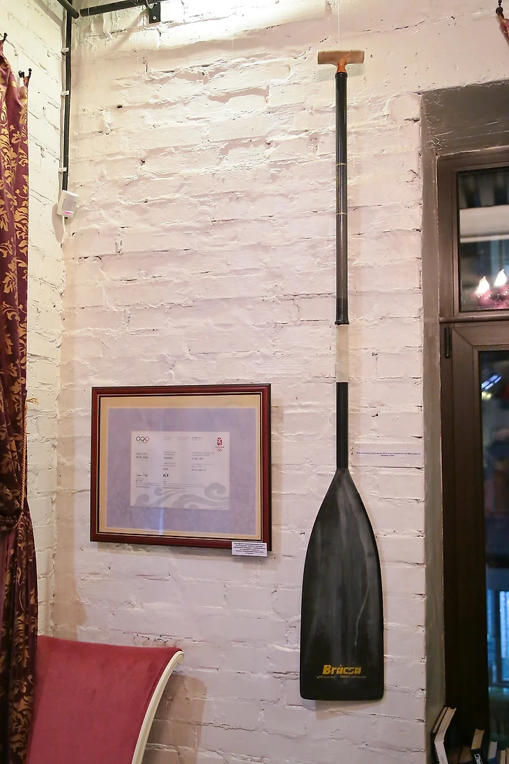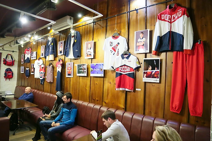 Первый этаж прошли, поднимаемся на второй. На стене представлена экипировка спортсменов.