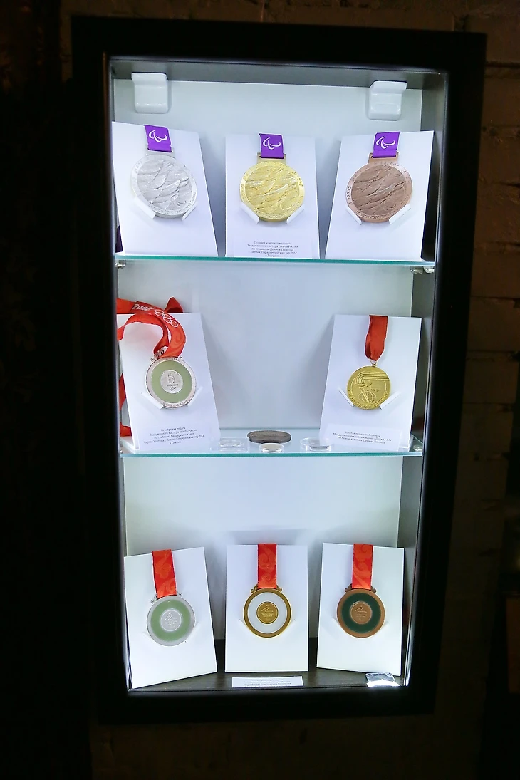 Комплекты медалей паралимпийских чемпионов Дениса Тарасова и Константина Лисенкова, а также серебряная медаль Пекина-2008 Сергей Улегина и золотая медаль победителя игр «Дружба-1984» по лёгкой атлетике Евгения Ломтева