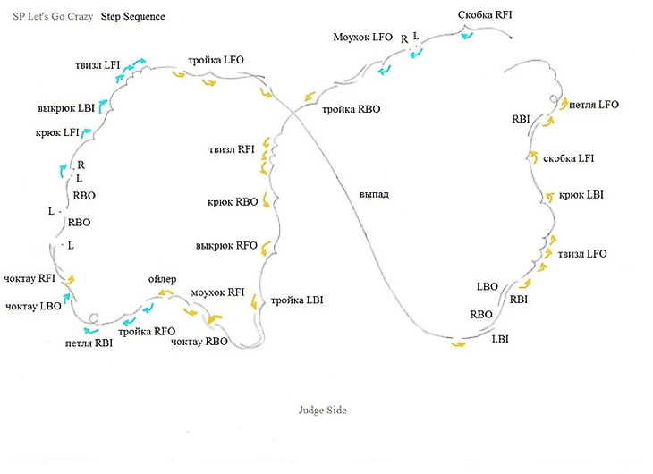 1. Засчитываются чисто исполненные 2 чоктау (п/ч и пр/ч), 2 крюка (п/ч и пр/ч), 2 выкрюка (п/ч и пр/ч), 2 твизла (п/ч и пр/ч), 2 петли (п/ч и пр/ч), 2 скобки (п/ч и пр/ч). Итого засчитывается 12 сложных поворотов и шагов (необходимый минимум 11 сложных поворотов и шагов).