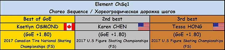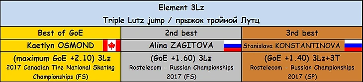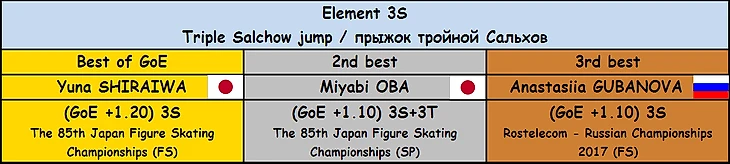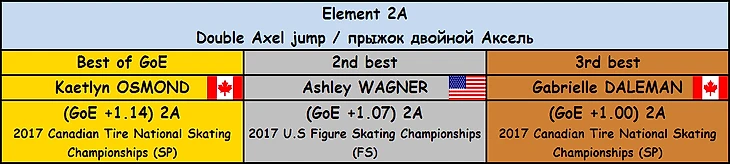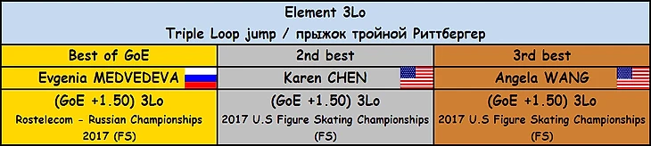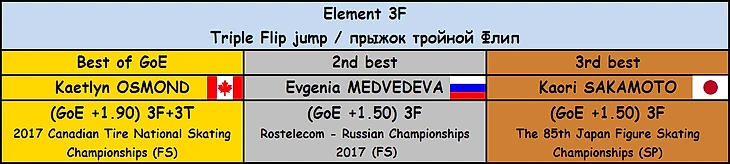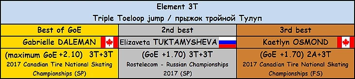 2. При сравнении лучших ГОЕ за прыжки, используются также прыжки исполненные в каскаде. При условии, что оцениваемый прыжок в каскаде самый дорогой, т.е. тот по которому ГОЕтся весь каскад. Например 3Т оценится в каскадах 3Т+3Т или 2А+3Т или 3Т+2Т и аналогичные. В случае например 3F+3Т участия не принимает, т.к. в этом каскаде ГОЕтся по 3F а не по 3Т.