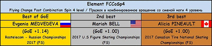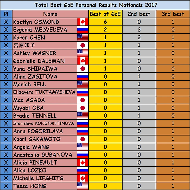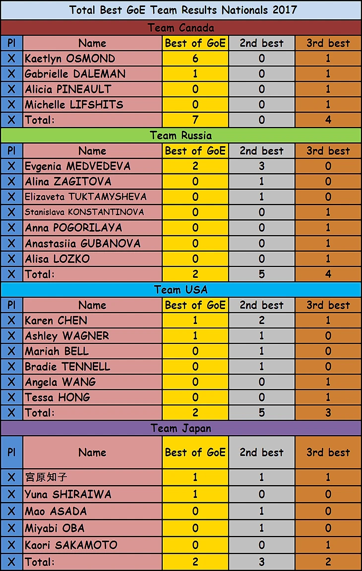 Закончились национальные чемпионаты сильнейших федераций фигурного катания. И как обычно на таких чемпионатах судьи становятся немного лояльнее. Ну не настолько же! Однако какие из элементов были исполнены оценены лучше всего по мнению судей? Попробуем разобраться. Для этого возьмем все протоколы 4х нацчемпионатов: России, Канады, США и Японии. Выпишем одинаковые элементы из протоколов, и найдем среди них лучшие ГОЕ.