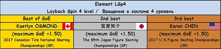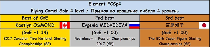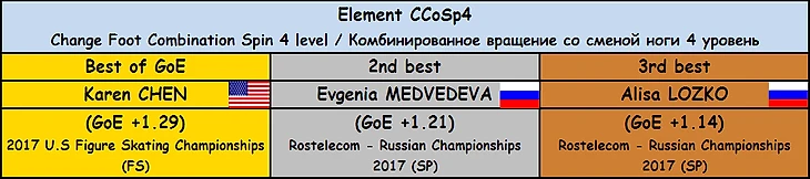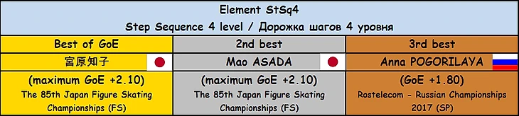 4. В номинации участвуют только тройные прыжки и аксель 2,5. Т.к. двойные на соревнованиях исполняют как правило фигуристки низкого уровня подготовки, те которые не обладают пока в наличии тройным прыжком, а те кто владеет тройными то исполняют двойные либо в результате ошибки, либо в каскаде со старшим тройным. Вращения участвуют все 4-го уровня, т.к. как по факту оказалось, что ГОЕ у вращений ниже 4-го уровня были всегда ниже чем ГОЕ у 4-го уровня.