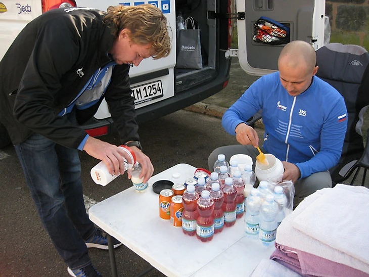 «Тяжелая трасса, то спуск, то подъем, даже поесть негде было», – пока микроавтобус превращается в раздевалку, гонщики успевают кое-что обсудить. Массажисты Киренкин и Пакура тем временем готовят для них восстанавливающие коктейли.