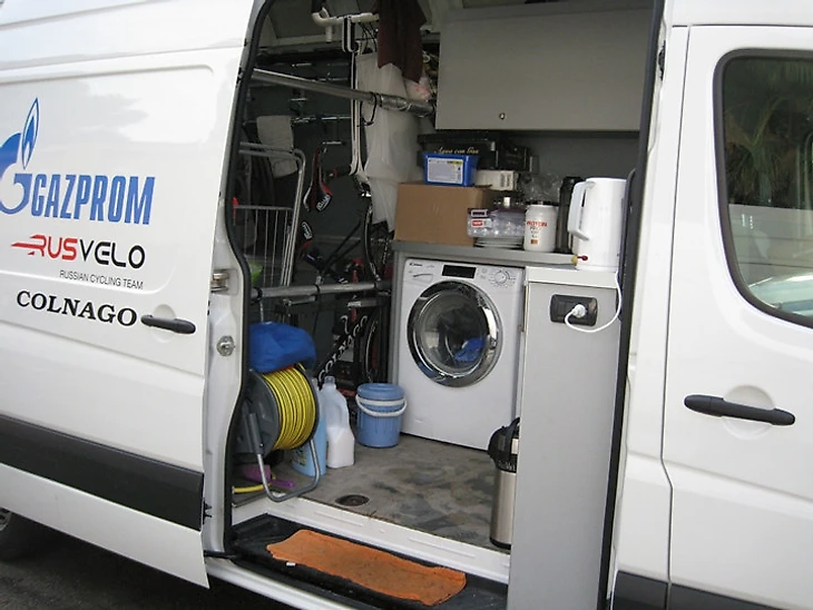 В автопарке «Газпром-РусВело» еще два микроавтобуса – ремонтный (здесь инструменты и оборудования для обслуживания велосипедов) и хозяйственный – с холодильником, стиральной машиной, чайником, микроволновкой.