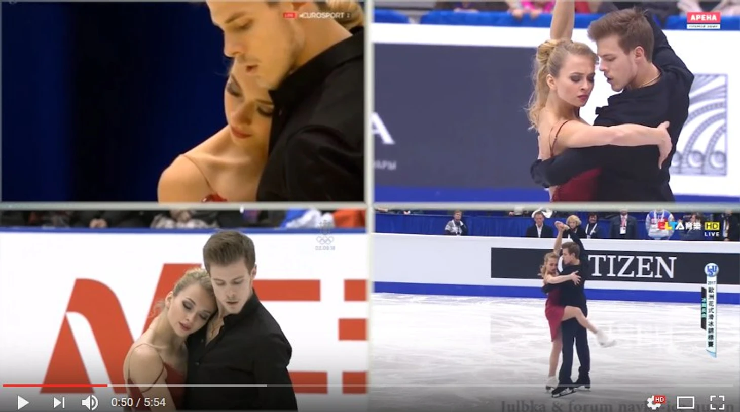 Чтобы увидеть, как изменился танец с начала сезона, я решила соединить в одно видео танцы, исполненные на четырех стартах - этапах Гран-при в Китае и Японии, чемпионате России и чемпионате Европы. При одновременном просмотре стало видно, что танец на этапах Гран-при отличается от танца на чемпионатах России и Европы, ощущение, будто это два разных танца. При этом и между собой они тоже немного различаются. Также хорошо видно, что очень мало одинаковых моментов во всех четырех танцах. Встречаются попарные совпадения, иногда совпадают моменты в трех прокатах. Совпадений в четырех прокатах я не заметила.