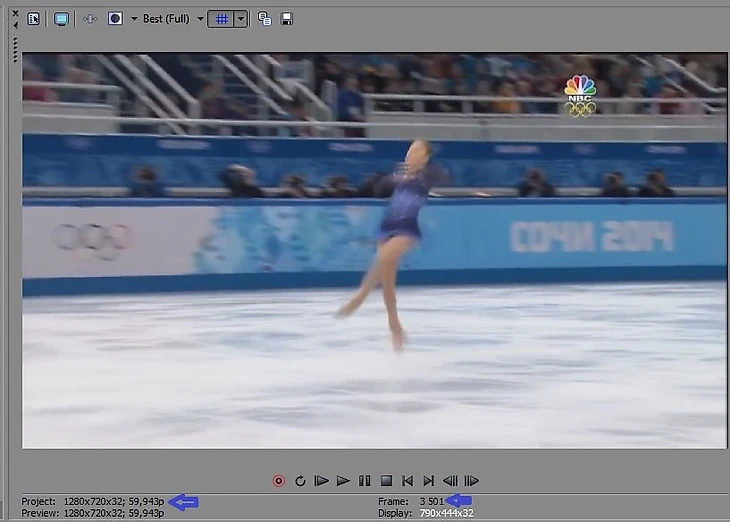 2) Далее средствами Sony Vegas Pro (не самый крутой, но всё же профессиональный видеоредактор, а у нас задача и не требует особой крутизны) устанавливал в проекте реальные свойства видео (качество, фпс, например, 59,94 fps как в скрине ниже и т.д.), и определял последний момент перед отрывом (на скрине - 3501-й кадр):