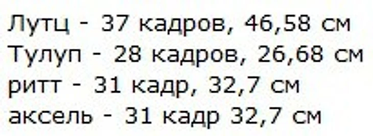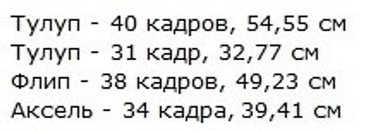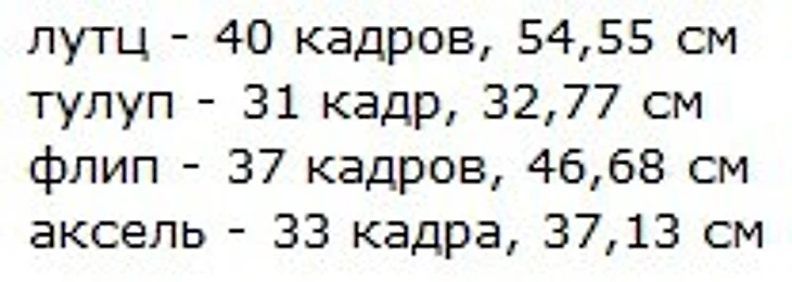 3) Далее происходит элементарный подсчёт. На видео прыжок занимает 32 кадра при fps 59,94 кадр/сек. Значит, время, проведённое в воздухе Липницкой на лутце: 32/59,94 = 0,53386......сек. Далее, подставляя это значение вместо t в формуле, получаем, что высота прыжка = 34,91 см. Округляю до сотых.