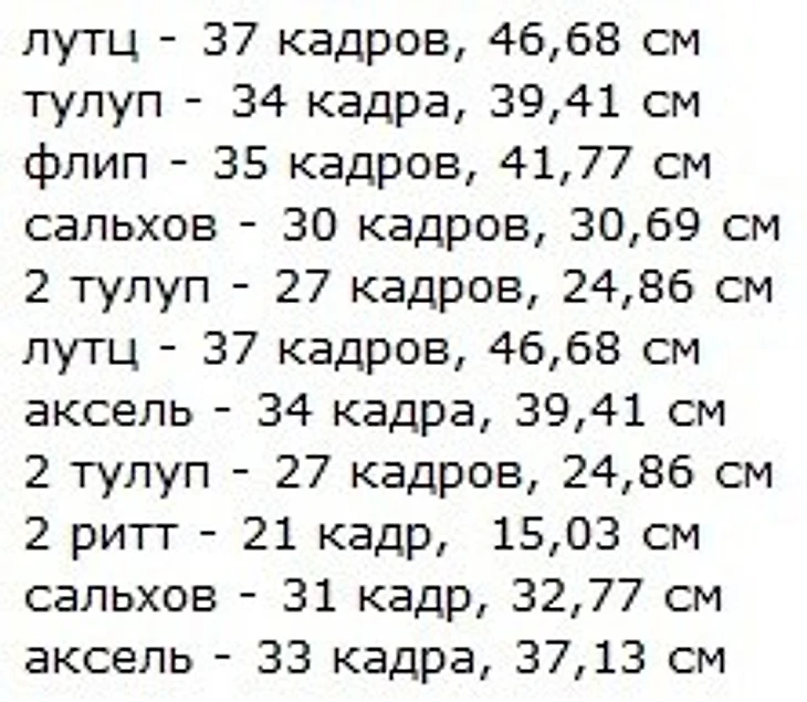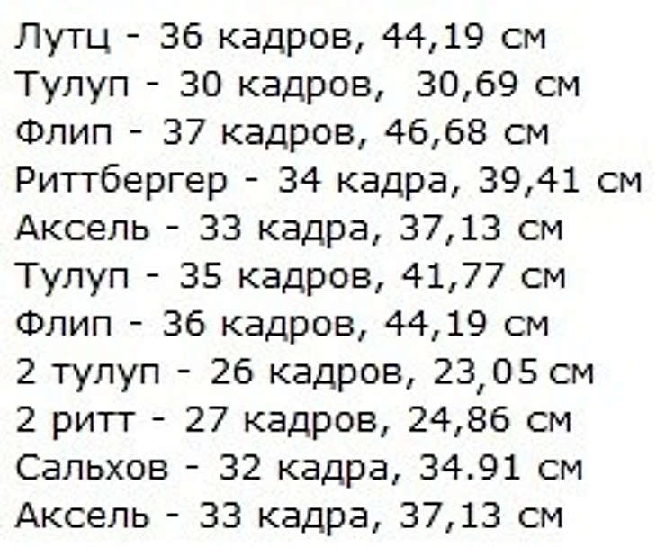 1) Для подсчёта логично было взять последний наиболее крупный турнир - Олимпиаду в Сочи. Старался находить запись фигуристки с наибольшим возможным fps. FPS - количество кадров в секунду. Понятно, что чем оно больше, тем более подробно показано движение фигуристки и точнее результат. Кстати, еще один не то, чтобы недостаток, но нюанс метода при работе с видео - он очень требователен к качеству записи. Желательно 1080p, в нашем случае это почти всегда 720p. Также желательно работать хотя бы с 50, а лучше 60 fps, т.к. при 30 и тем более 25 получается слишком серьёзная погрешность в пользу (!) фигуриста. ФПС важен для наиболее точного определения момента отрыва и касания льда коньком. Когда фпс небольшой, на видео может быть показан более поздний, чем реальный, момент при приземлении и более ранний моменты отрыва.