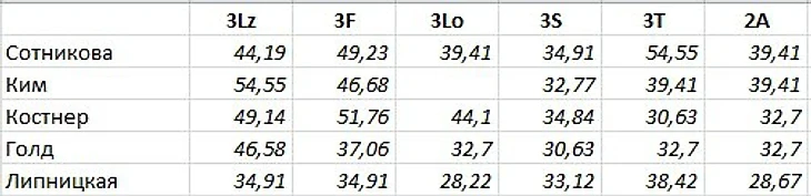 Отметим, что Ким никогда не исполняла тройной риттбергер, поэтому у неё единственной в списке программа из 6 тройных, 2 дупелей и 3 двойных (как и у всех 11 прыжков всего). Однако даже без 3р, а лишь с 2р обе суммы очень серьёзные.