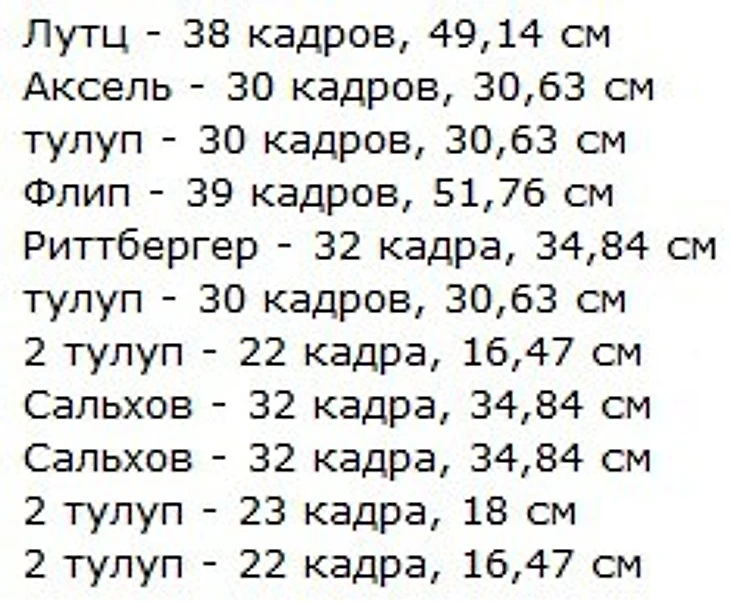 4) А?:) Что?:) Да, я знаю, дорогой мой, какой вопрос тебя волновал в течение всего исследования. Да, я измерил по высоте и прыжки Медведевой на чемпионате Европы 2017. Вот мой результат: по сумме в ПП у Евгении 341,22 см, с учётом только тройных и дупелей = 308,29 см. Два прыжка за 40: флип в каскаде (41,77 см), лутц (41,77 см). Ещё два близко: сальхов и флип (39,41 см). Так что когда начнётся очередной базар за "низенько, круточкой", суй базарящему смело эти цифры и говори: "Не хуже, чем у Костнер в Сочи!"