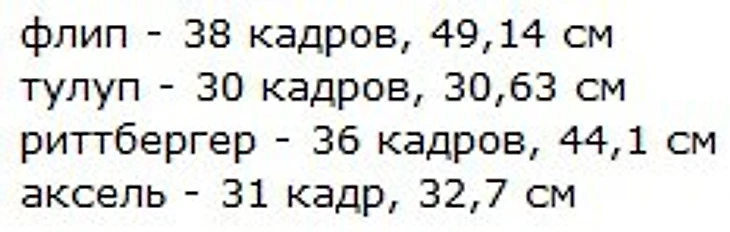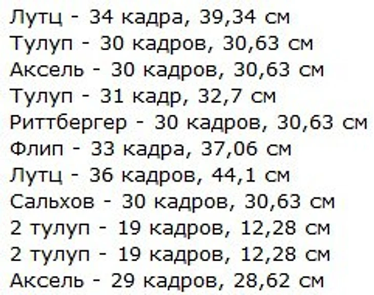 Я знаю, что реальная скрутка прыжка почти всегда начинается еще на льду, особенно у женщин, а также то, что так называемый недокрут или докрут на приземлении обычно считается по моменту перехода хотя бы частично на ребро, а не "по зубцам". Но в нашем случае важна лишь чистая высота, а не обороты, поэтому мы берем исключительно полёт и касание судим по зубцам.