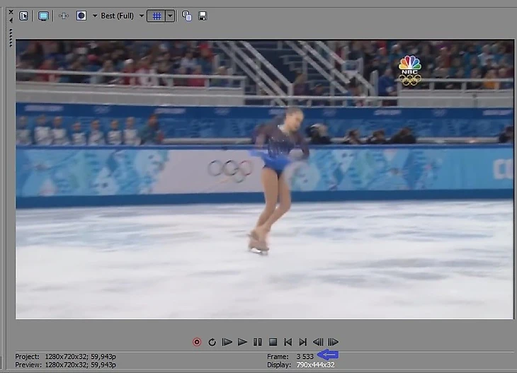 и отсчитывал, какое количество кадров занимал полёт вплоть до касания на приземлении. Соответственно, последний момент перед отрывом у нас - условный 0 кадров, момент касания - то количество кадров, которое фигуристка находилась в воздухе, т.е на скрине ниже 3533 - 3501 = 32 кадра: