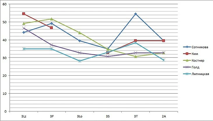 Таблица и график по лучшим прыжкам для каждой фигуристки: