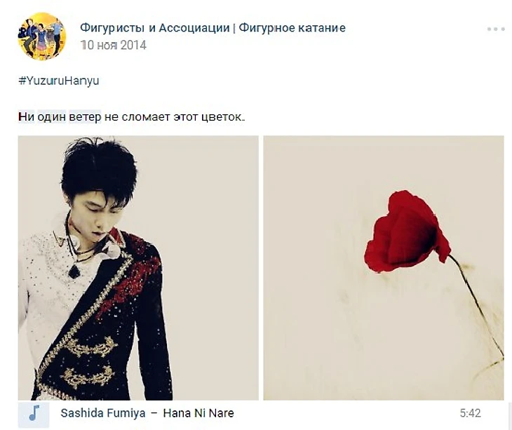 "Когда в моей жизни наступает черная полоса, случаются какие-то неприятности, ссоры с близкими, то я просто включаю интервью Юзуру, его прокаты и забываю обо всех неприятностях. На фоне того, что пришлось пережить ему, мои проблемы кажутся "детским лепетом". Спасибо тебе, Юзуру, просто за то, что ты есть."